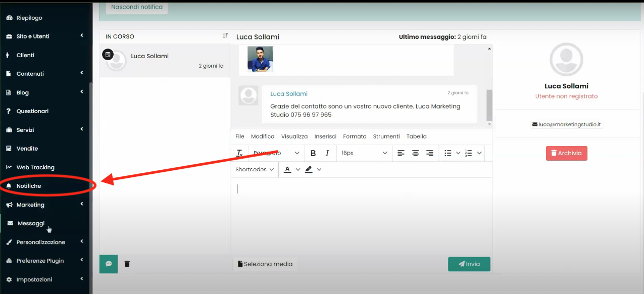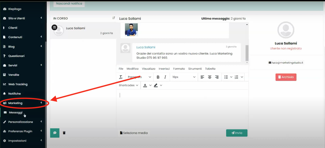 À travers la section Marketing, vous pourrez, en revanche, créer des campagnes d'envoi de mails, sms ou d'envoi de messages sur toutes les plateformes de messagerie.