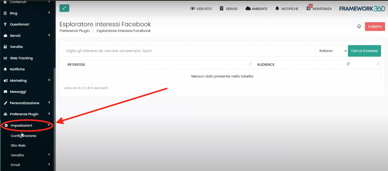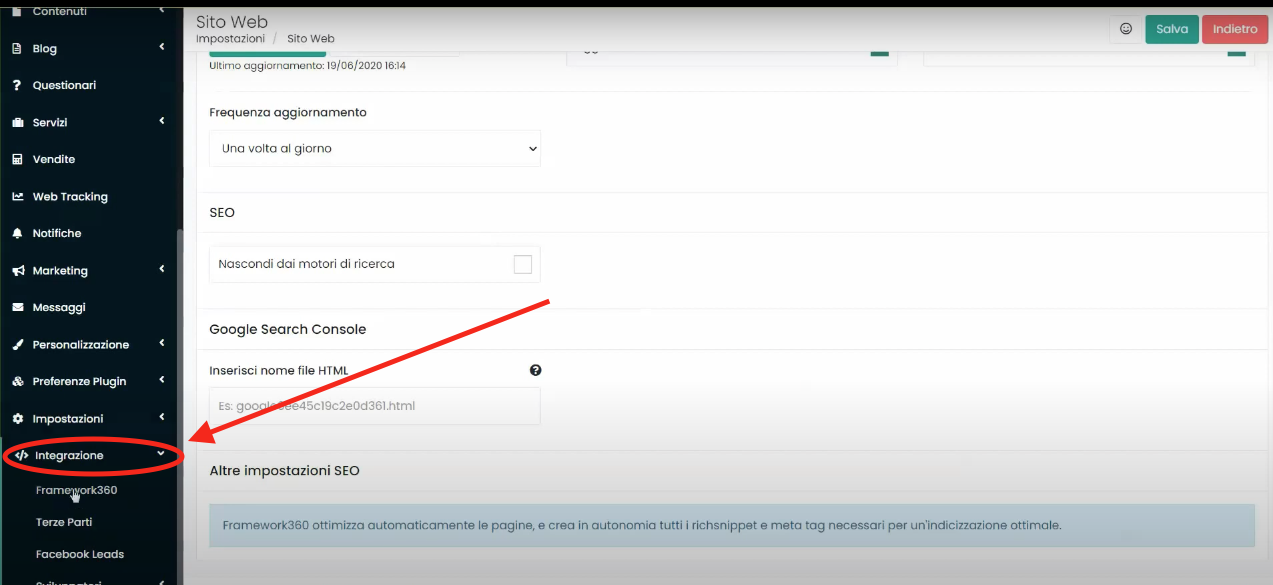 Avec la section Intégration , nous pourrions intégrer notre environnement Framework360 avec d'autres plateformes ; par exemple, si nous possédons un autre site web réalisé avec Wordpress, nous pourrions étendre certaines fonctions de Framework360 sur ce site web.